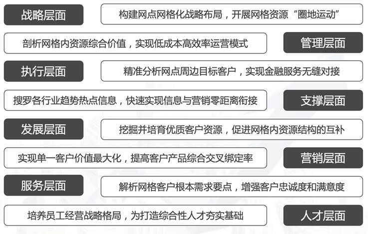 網(wǎng)格化是近年來很多銀行推崇的一種先進(jìn)的營銷管理模式,已被廣泛地運用于精準(zhǔn)市場拓展?fàn)I銷的活動中。銀行網(wǎng)點作為以客戶服務(wù)主要依托的經(jīng)營型企業(yè),在市場營銷中,采取地圖營銷、網(wǎng)格管理、精準(zhǔn)策略,可將客戶的心理需求與其日常生活緊密地聯(lián)系起來,巧妙運用網(wǎng)格化管理和營銷地圖,以此來實現(xiàn)客戶的營銷精準(zhǔn)度與價值提升,提高單一客戶貢獻(xiàn)值和營銷效率。同時也可以最直觀地反映市場動態(tài),發(fā)現(xiàn)市場上的問題,有助于銀行有效地制定銷售戰(zhàn)略。