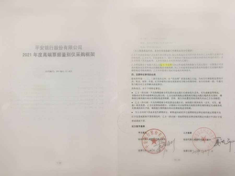 2021年4月7日,盛金源喜簽下平安銀行2021年度高端票據(jù)鑒別儀的采購合同。