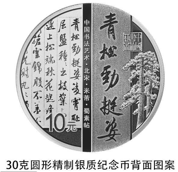 30克圓形銀質紀念幣背面圖案為北宋米芾書《蜀素帖》局部文字及“青松勁挺姿”字樣與松樹、“中國書法藝術”篆刻鈐印等組合設計,并刊“中國書法藝術·北宋·米芾·蜀素帖”字樣及面額。