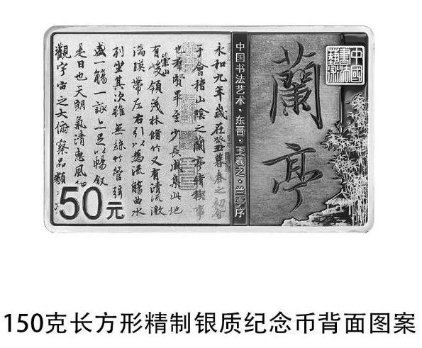 150克長方形銀質紀念幣背面圖案為東晉王羲之書《蘭亭序》局部文字及“蘭亭”字樣與竹林、亭子、“中國書法藝術”篆刻鈐印等組合設計,并刊“中國書法藝術·東晉·王羲之·蘭亭序”字樣及面額。