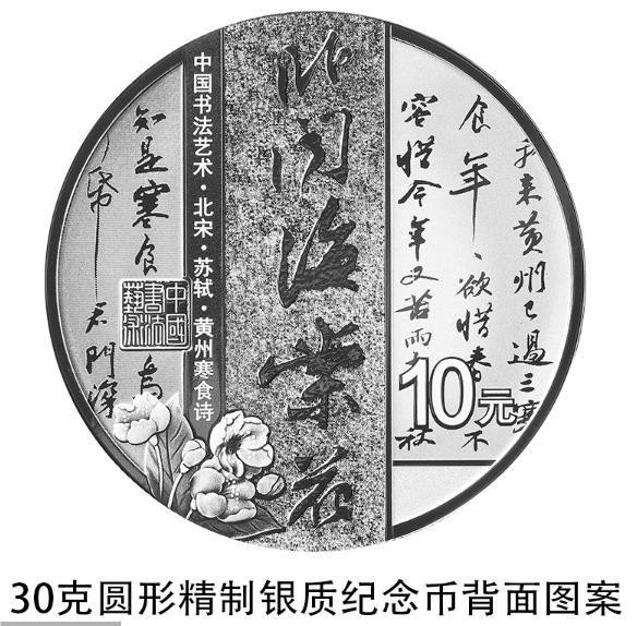 30克圓形銀質紀念幣背面圖案為北宋蘇軾書《黃州寒食詩》局部文字及“臥聞海棠花”字樣與海棠花、“中國書法藝術”篆刻鈐印等組合設計,并刊“中國書法藝術·北宋·蘇軾·黃州寒食詩”字樣及面額。
