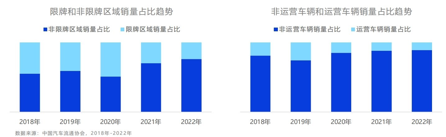 從市場驅(qū)動(dòng)力來看,新能源汽車產(chǎn)業(yè)發(fā)展驅(qū)動(dòng)力正逐漸由“政策主導(dǎo)”轉(zhuǎn)向“市場主導(dǎo)”和“用戶主導(dǎo)”,新能源車市場需求開始大量釋放。近5年數(shù)據(jù)顯示,從限購城市分布來看,七個(gè)汽車限購城市新能源汽車銷量占比呈降低趨勢,而非限購城市銷量占比則逐漸提升,非限牌區(qū)域新能源車占比穩(wěn)步增長,已由2018年55.4%增長至2022年75.5%。用戶主動(dòng)購買意愿提升明顯。并且,C端消費(fèi)市場也在不斷崛起(2019年主機(jī)廠向B端市場大量拋售,以抓住新能源財(cái)政補(bǔ)貼退坡前最后紅利,導(dǎo)致C端消費(fèi)市場份額出現(xiàn)短暫的萎縮),2022年占比達(dá)88.6%,相比2018年提升了8個(gè)百分點(diǎn)。