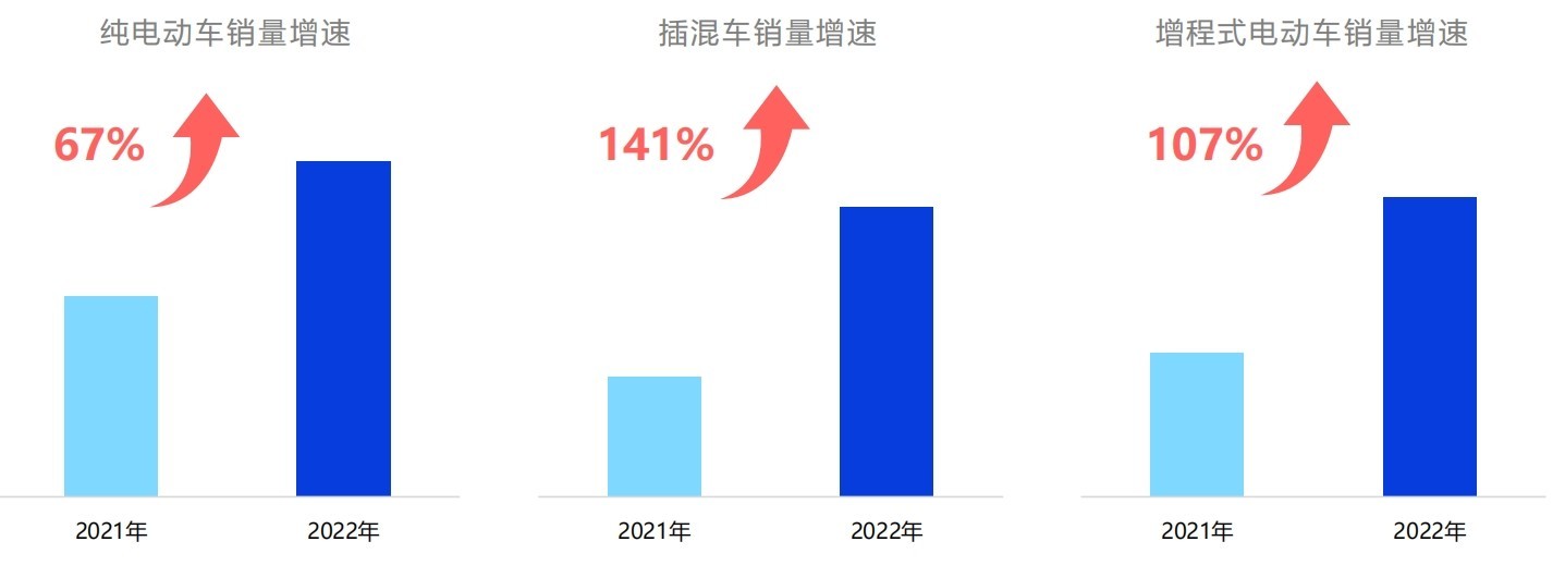 新能源汽車的爆發(fā)是插混車型和增程式電動(dòng)車的爆發(fā)從新能源車分類來看,2022年純電動(dòng)車銷量依舊保持高速增長,而插混車型和增程式電動(dòng)車則出現(xiàn)超過一倍的爆發(fā)式增長。隨著車型的豐富和成熟,用戶的選擇更為多元化。