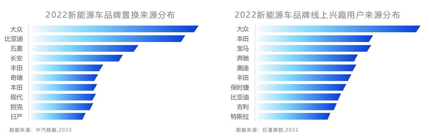從用戶購車置換數(shù)據(jù)來看,購買新能源車的用戶主要來源于主流燃油車品牌的車主,而從抖音線上興趣用戶的流轉(zhuǎn)情況來看,新能源車的興趣用戶也都大多來源于燃油車品牌興趣用戶,故無論線上還是線下,均呈現(xiàn)新能源車逐漸向燃油車滲透的趨勢。隨著中國進(jìn)入汽車市場的存量階段,大規(guī)模的置換周期逐漸到來,換購需求的加速增長也成為新能源汽車發(fā)力的助推劑。